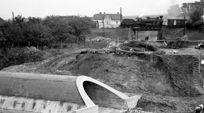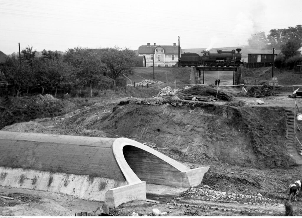 Budowa drogi Kraków-Wieliczka-Lwów, zdjęcie z września 1935 roku. Widoczny przepust drogowy. Fot. Archiwum Narodowe Archiwum Cyfrowe.